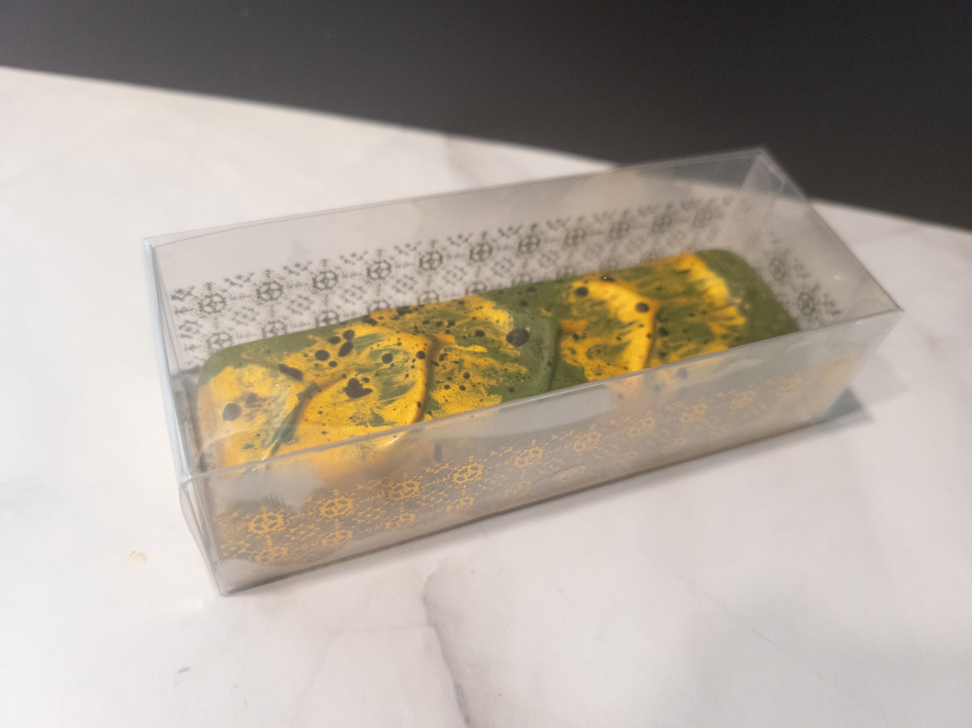 Our take on the viral Dubai Bar! Our house-made pistachio praline, white chocolate, and toasted katafi phyllo pieces, combined with our sea salt caramel. All enclosed in 65% dark chocolate! It's a perfect combination of salty caramel and pistachio.